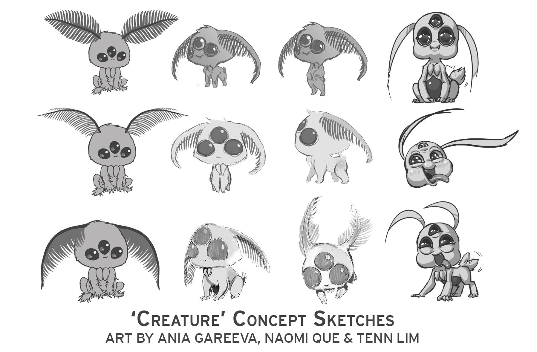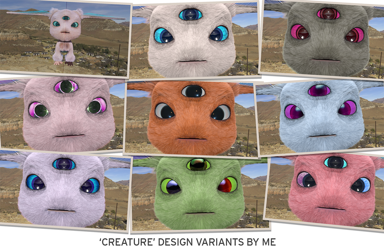 For the main creature I did a lot of work with the Groom/CharFX artist, rigger and art director in order to try and create a creature who was alien, but adorable like a plush toy. This involved a lot of work coming up with multiple variants for the creature’s fur, eye and skin colour, until we decided on dark eyes with a blue sclera along a light skin with white fur. Due to difficulties with converting materials from Houdini to Katana, I also helped create the lookdev of the fur material, using ‘PxrMarschnerHair’ within Katana itself.