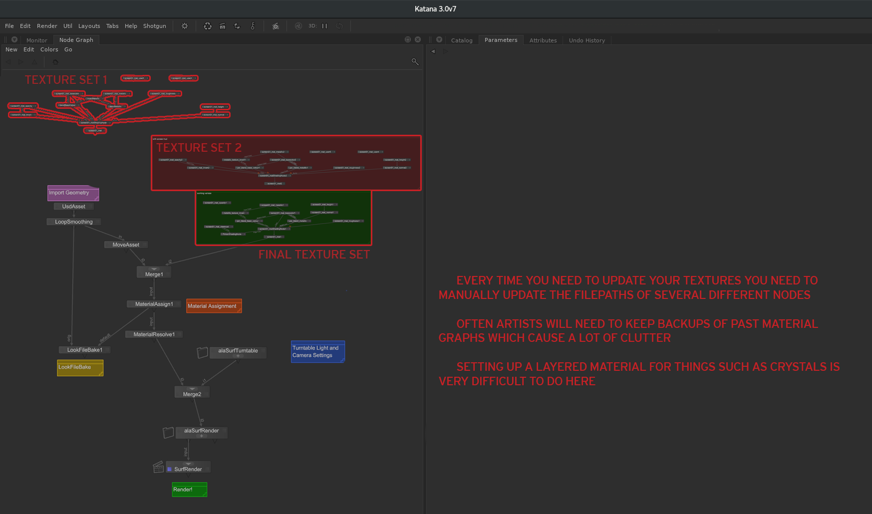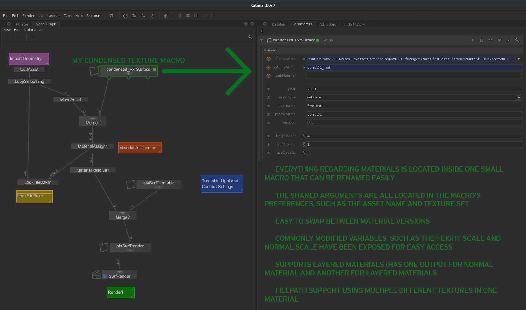 In between working on asset creation and surfacing, I spent some free time on improving this workflow, where I ended up creating some macros in Katana to handle automatic version control and layering using the ‘PxrLayer’ shaders. I also worked on updating the pipeline to handle these changes to storing multiple texture maps. With these changes the task from creating a material in Substance Painter to getting a rendered turntable in Katana went from 3+ days to just under 4-5 hours.